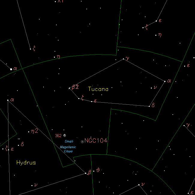 Now, keep binoculars and telescopes handy we're off to the next globular cluster - NGC 362 (RA 1 : 03.2 Dec -70 : 51). At near magnitude 7 and 12 arc minutes in size, this much smaller globular was discovered by James Dunlop on August 1, 1826. You'll find it compact and very pretty in a smaller scope and well-resolved in large aperture. In 1980 this particular star cluster was compared to a similar one, only to find it was about 3 billion years younger!
