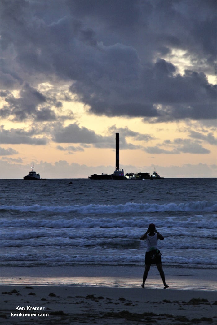 The doubly used and doubly successful booster entered the mouth of Port Canaveral around 7:15 a.m. EDT Sunday under dawns delightful twilight I witnessed from Jetty Park and beach together with a few space media colleagues and a small crowd of onlookers with little fanfare.