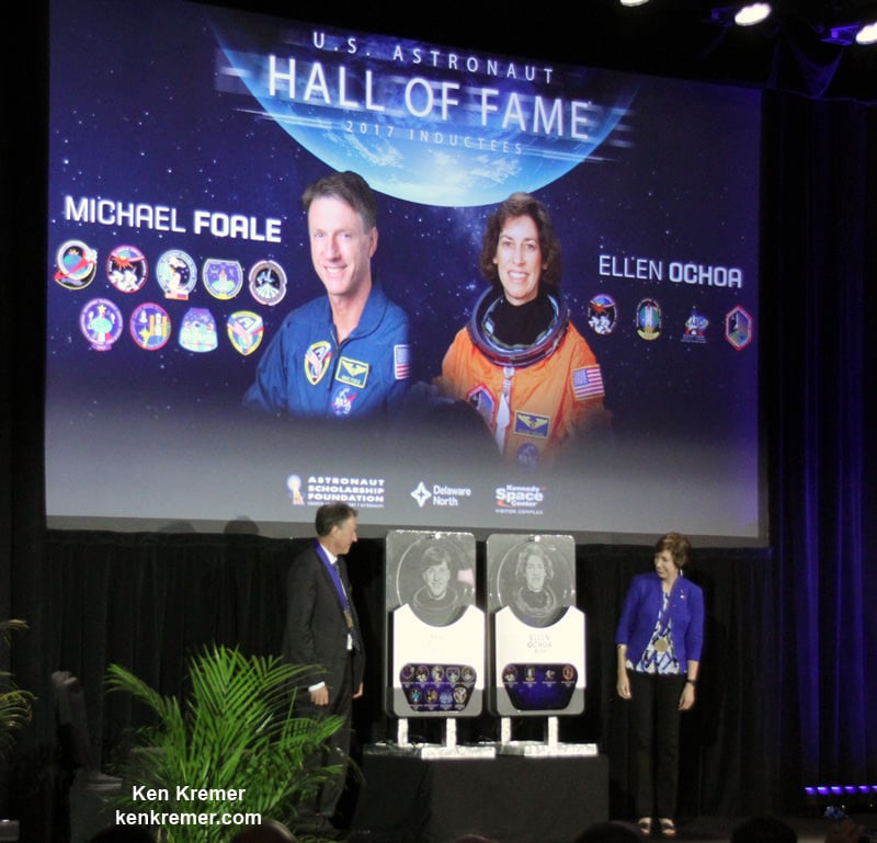 Two veteran retired NASA astronauts - Michael Foale and Ellen Ochoa - were inducted into the U.S. Astronaut Hall of Fame on May 19, 2017 during induction ceremony held below Space Shuttle Atlantis in the display pavilion at the Kennedy Space Center Visitor Complex in Florida. Credit: Ken Kremer/kenkremer.com