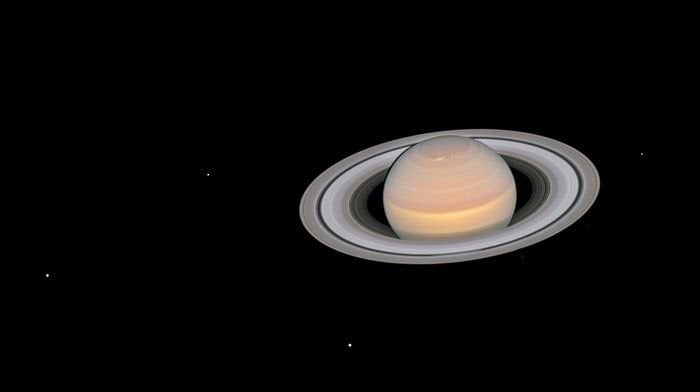 This composite image, taken by the NASA/ESA Hubble Space Telescope on 6 June 2018, shows the ringed planet Saturn with six of its 62 known moons. Image: NASA, ESA, A. Simon (GSFC) and the OPAL Team, and J. DePasquale (STScI)[/caption]