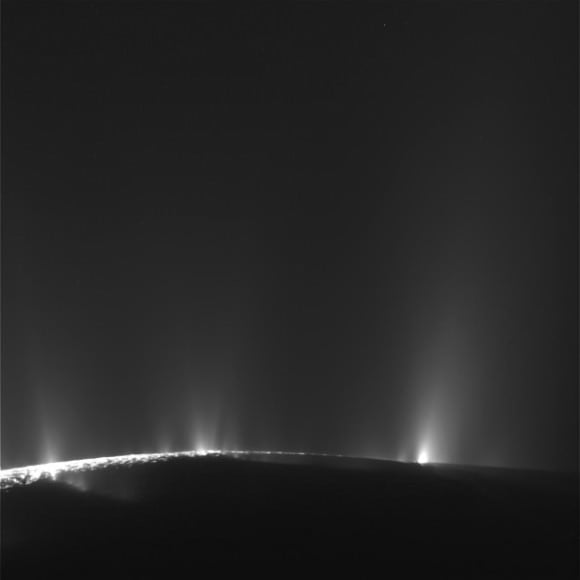 Cassini image of ice geysers on Enceladus. Image: (NASA/JPL/SSI)[/caption]
