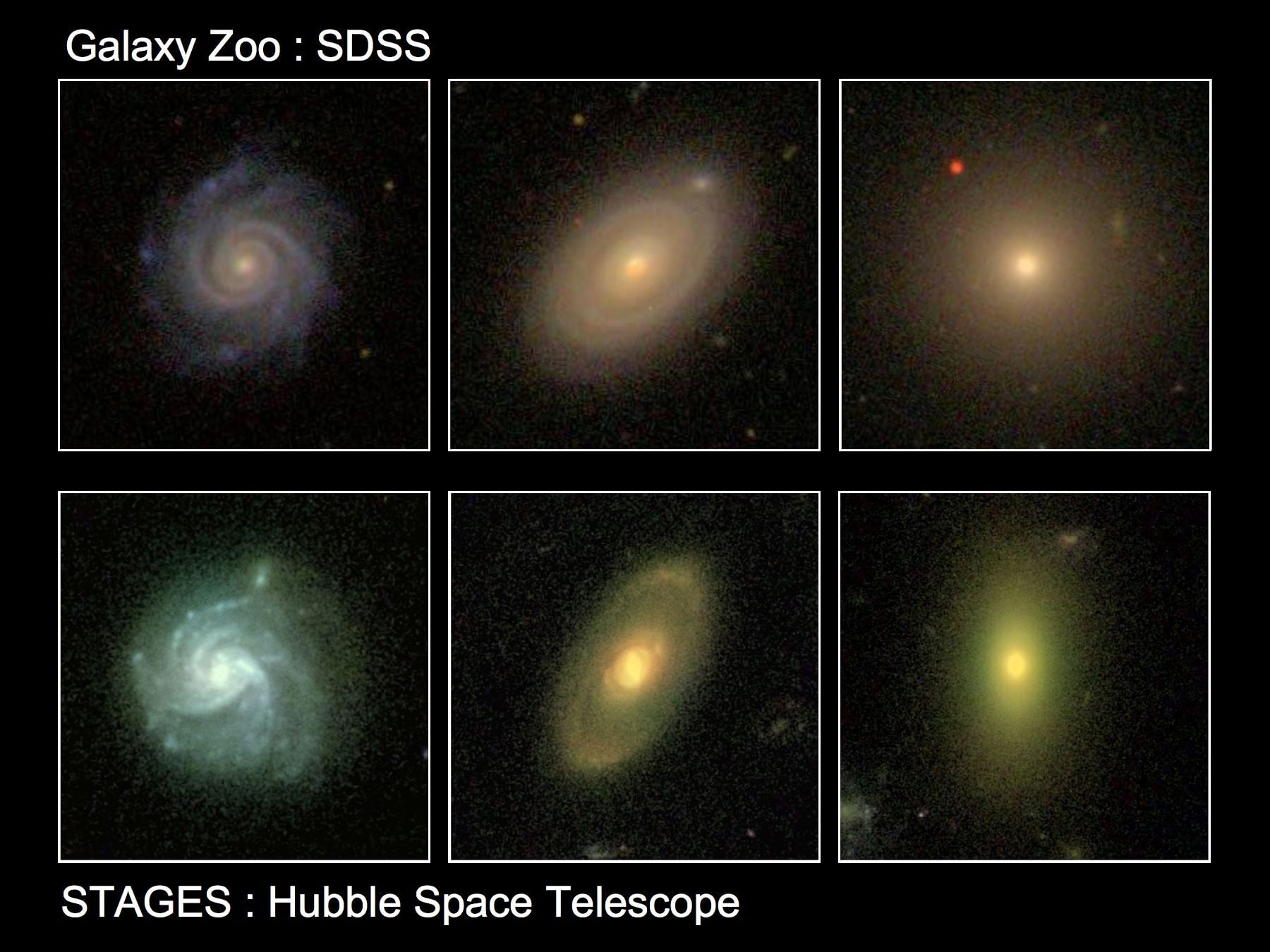 The STAGES team used the Hubble Space Telescope to look in detail at one particular very large cluster of galaxies, known as the A901/902 and found a surprisingly large number of red spiral galaxies. But they didn't know if what they were seeing was unusual to only that cluster or even that particular region of space. However the Galaxy Zoo team had found red spirals all across the universe. "STAGES had more detailed observations," said Linott, "but we showed this is something that happens across the population of galaxies. So it's nice when you can attack it from both ends at once."