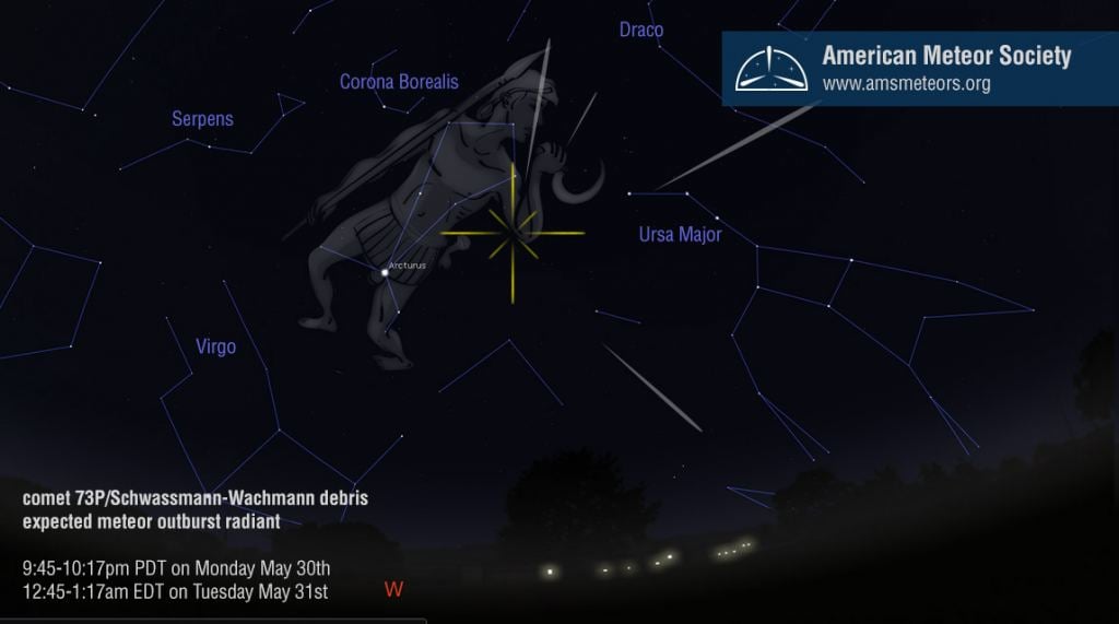 As of writing this, the American Meteor Shower (AMS) has refined the key encounter time to 4:45-5:17 Universal Time (UT) / 12:45-1:17 AM U.S. Eastern Time EDT on the morning of Tuesday, May 31stor 9:45-10:17 PM Pacific Time PDT on the evening of Monday, May 30th. The radiant will be right at the zenith for Baja California around this time, though most of North and South America will be well-placed to witness any uptick in meteor activity. The Moon also reaches New the day prior on May 30th… another plus.