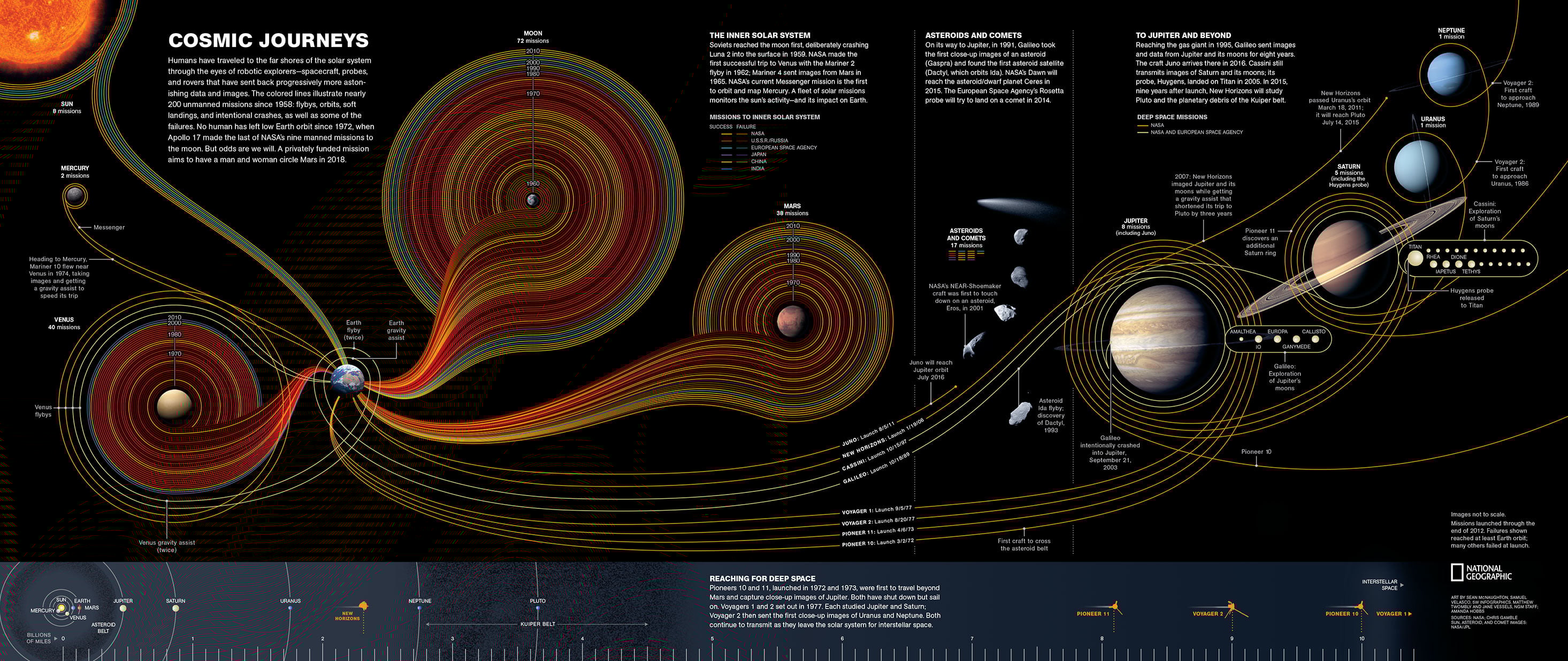 Other features of the graphic worth noting are the growing number of moon and Mars missions and the current locations of spacecraft in the outer solar system (or in Voyager 1's case,