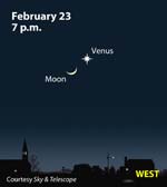 Image credit: Sky and Telescope Treat yourself to an eye-catching celestial treat on Monday evening, February 23, 2004. At dusk, just look to the west. There you'll find Venus, the magnificently brilliant "