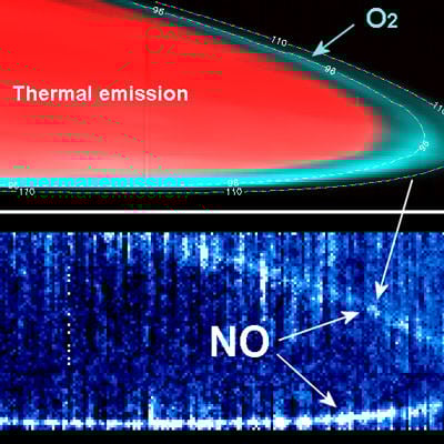 The nightglow on Venus has been seen at infrared wavelengths before, betraying oxygen molecules and the hydroxyl radical, but this is the first detection of nitric oxide at those wavelengths. It offers data about the atmosphere of Venus that lies above the cloud tops at around 70 km. The oxygen and hydroxyl emissions come from 90-100 km, whereas the nitric oxide comes from 110-120 km altitude.