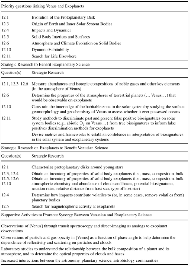 This is in line with what the recent Planetary Science and Astrobiology Decadal Survey said. That survey covers a lot of territory, and it showed the links between Venus and exoplanets and how the study of each can inform the other. The authors of the paper made a table of parts of the Decadal Survey that link Venus and Exoplanet science.