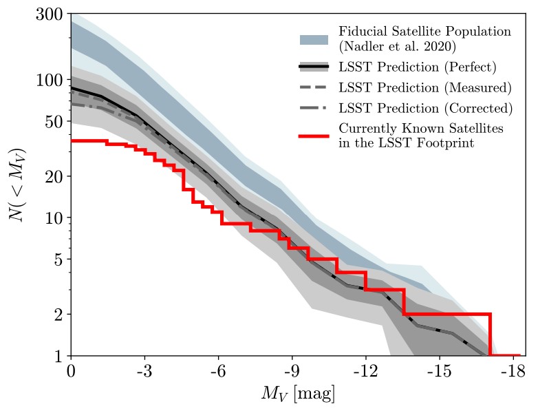 This figure illustrates some of the research results. Models predict there could be about 300 Milky Way satellites, labelled the Fiducial Satellite Population. The other lines show three predictions for the LSST, and the red line indicates currently known satellites. Image Credit: Tsiane et al. OJA 2025.