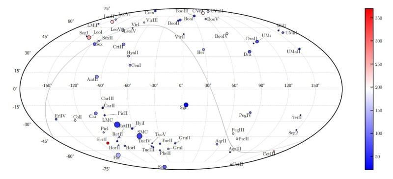 This figure shows the Milky Way dwarf galaxy population. The size of the dot indicates the galaxy's relative size, and the colour bar represents its distance from the Sun. Image Credit: Pace 2024.