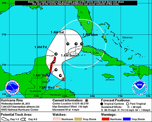 Rina's maximum sustained winds remained steady at about 110 mph early Wednesday, said the U.S. National Hurricane Center in Miami, making it a Category 2 storm. Forecasters predict it will strengthen to a major hurricane as it nears the Mexican coast Wednesday night before rolling over the island of Cozumel, then along the coast to Cancun.