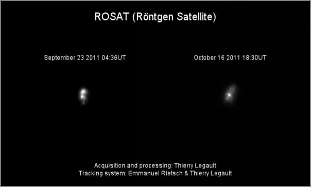 I was waiting for this, and I know our readers have been looking forward to seeing astrophotographer Thierry Legault's images of the ROSAT satellite as it heads towards its uncontrolled re-entry through Earth's atmosphere to its ultimate demise. Legault took a series of images on October 16, 2011 from France and combined them into a video. The speed of the sequences is accelerated 3 times with regard to real time (30 frames per second vs 10 fps). The distance to observer is 275 km, with the altitude of the satellite at 235 km. Angular speed at culmination: 1.66°/s.
