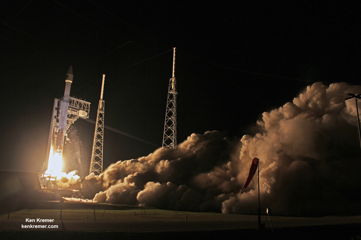 Nighttime blastoff of ULA Atlas V rocket carrying the USAF SBIRS GEO 3 missile defense satellite to orbit on Jan. 20, 2017 from Space Launch Complex-41 at Cape Canaveral Air Force Station in Florida. Credit: Julian Leek[/caption]