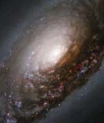 Fine details of the dark band are revealed in this image of the central portion of M64 obtained with the Hubble Space Telescope. M64 is well known among amateur astronomers because of its appearance in small telescopes. It was first cataloged in the 18th century by the French astronomer Messier. Located in the northern constellation Coma Berenices, M64 resides roughly 17 million light-years from Earth.