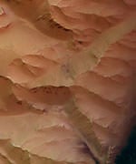 The Ius Chasma belongs to the giant Valles Marineris canyon system on Mars. The Geryon Montes, visible at the right of this image, is a mountain range which divides the Ius Chasma into two parallel trenches. The dark deposits at the bottom of the Ius Chasma are possibly related to water and wind erosion.