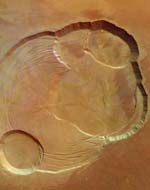 Olympus Mons has an average elevation of 22 km and the caldera has a depth of about 3 km. This is the first high-resolution colour image of the complete caldera of Olympus Mons.