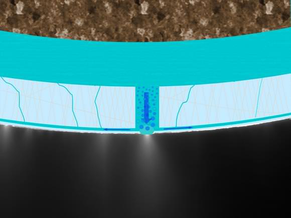 The schematic image (top) is laid on top of a picture of the Enceladus jets taken by Cassini's imaging cameras in November 2009. It shows bubbles in subsurface seawater traveling through a passage in the ice crust to feed a geyser. The water flows back down to the subsurface ocean through cracks in the ice.