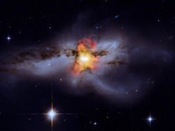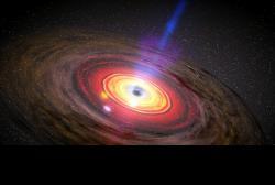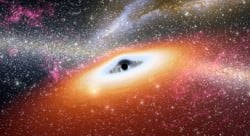 This artist's conception illustrates one of the most primitive supermassive black holes known (central black dot) at the core of a young, star-rich galaxy. Image credit: NASA/JPL-Caltech