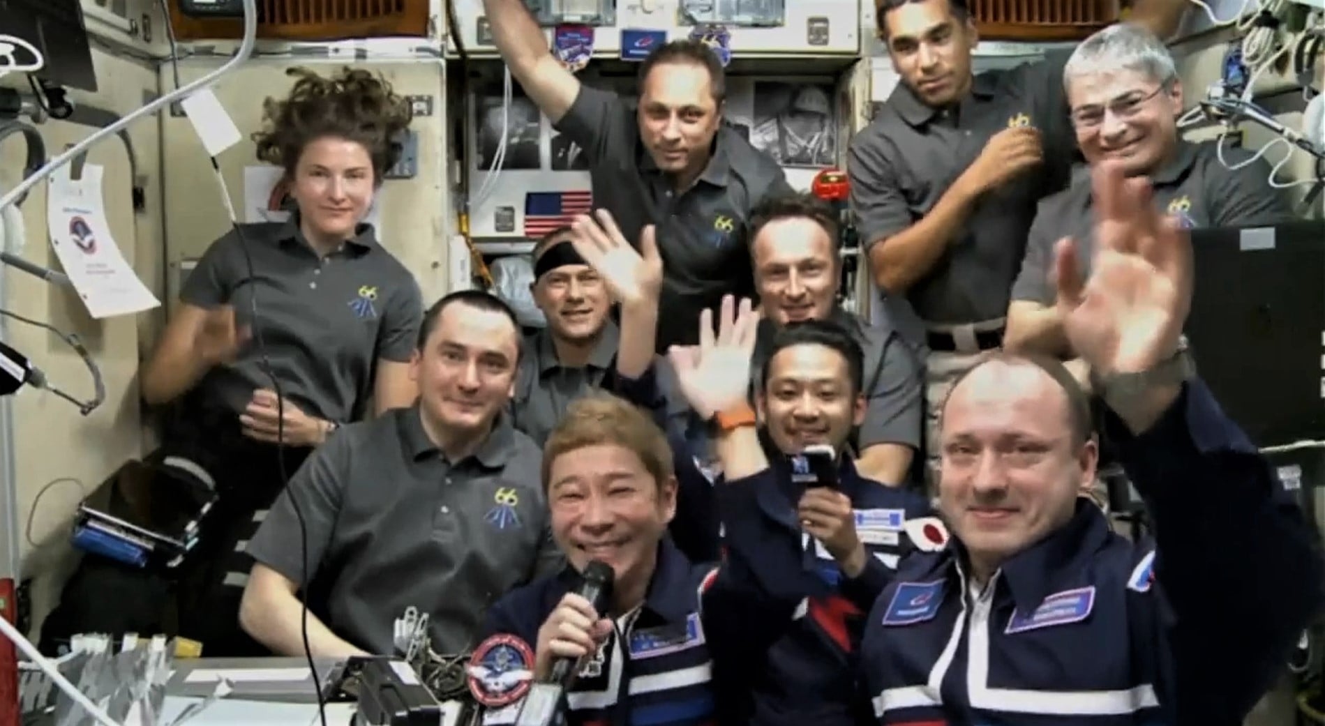 Hours later, the Soyuz docked with the station, and the trio floated inside to meet the orbital outpost's seven other spacefliers. Maezawa was all smiles as he greeted family and friends back on Earth over a video link.