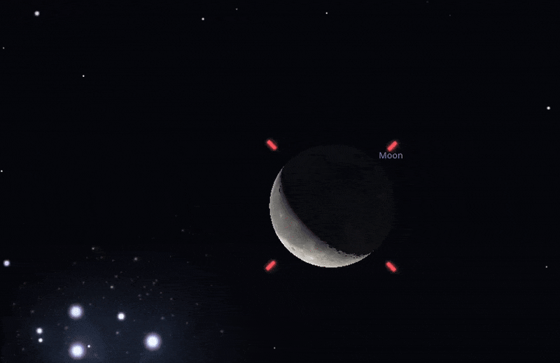 The passage of the 24% illuminated waning crescent Moon through Messier 45 is centered on 11:02 Universal Time (UT)/7:02 AM EDT. The transit occurs in the predawn hours for northern Mexico, the central and western United States, along with western Canada and Alaska. A strip from the central U.S. East Coast running to the northwest through the Great Lakes region sees the event transition through the brightening dawn sky into sunrise. Only the U.S. northeast and the Canadian Maritimes sit this one out. The pair is 58 degrees west of the rising Sun during the event.