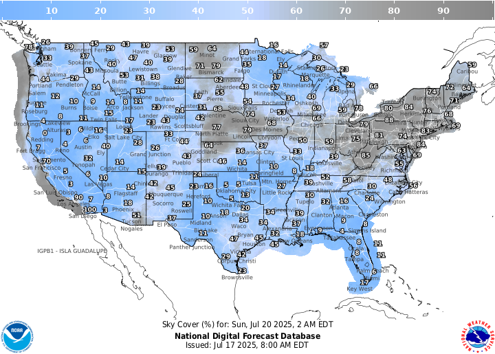 Cloud cover prospects over the CONUS for the morning of Sunday, July 20th. Credit: NWS/NOAA.