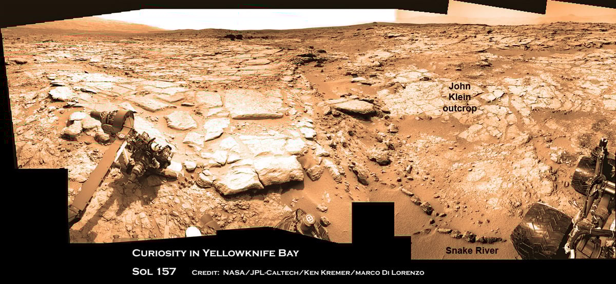 Curiosity found widespread evidence for flowing water in the highly diverse, rocky scenery shown in this photo mosaic from the edge of Yellowknife Bay on Sol 157 (Jan 14, 2013). The rover will soon conduct 1st Martian rock drilling operation at flat, light toned rocks at the outcrop called "John Klein", at center. 'John Klein' drill site and 'Sheep Bed' outcrop ledges to right of rover arm are filled with numerous mineral veins and spherical concretions which strongly suggest precipitation of minerals from liquid water. 'Snake River' rock formation is the linear chain of rocks protruding up from the Martian sand near rover wheel. Credit: NASA/JPL-Caltech/Ken Kremer/Marco Di Lorenzo