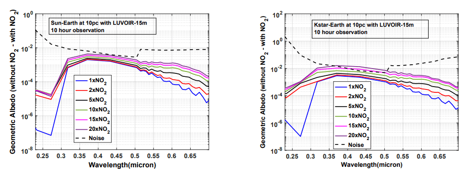 could possibly operate in the regime of 5× Earth NO2 level making it possible to detect it with LUVOIR-15m with even less observation time than for present-Earth conditions."