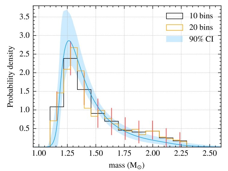 Early observations of neutron star (NS) masses developed only loose constraints on their masses, partly hampered by limited observational data. "For a long time, all observed neutron-stars masses were in a narrow range, consistent with a Gaussian distribution, with a mean of 1.35 solar masses and a width of 0.04 solar masses," the authors write. A Gaussian distribution forms a bell curve when graphed and the highest point is the mean. In textbooks and in studies, a mean mass of 1.4 solar masses is routinely used for NSs.