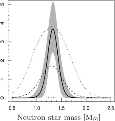 This graph from a2013 papershows the Gaussian distribution for neutron stars, where the mean mass is about 1.4 solar masses. Image Credit: Kiziltan et al. 2013.