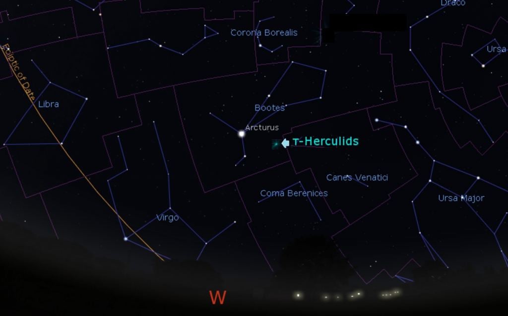 The Tau Herculids are a 'slow shower' with an inbound velocity of 16 km/second—slow that is, compared to, say the November Leonids, with a swift 72 km/second incoming velocity. Expect any Tau Herculids you see to be slow and stately emanating from a radiant near the globular cluster Messier 3, about a third the way between the bright star Arcturus and the end of the handle of the Big Dipper asterism.