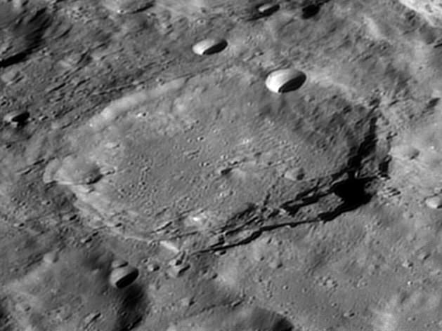 Once you've studied the Montes Riphaeus, you'll begin noticing another lunar crater that looks a whole lot like a smaller version of Copernicus - the highly under-rated crater Bullialdus. Located close to the center of Mare Nubium, even binoculars can make out Bullialdus when near the terminator. If you're scoping - power up - this one is fun! Very similar to Copernicus, Bullialdus' has thick, terraced walls and a central peak. If you examine the area around it carefully, you can note it is a much newer crater than shallow Lubiniezsky to the north and almost non-existent Kies (a real challenge) to the south. On Bullialdus' southern flank, it's easy to make out its A and B craterlets, as well as the interesting little Koenig to the southwest.