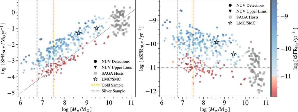 The second study focuses on star formation in the satellites. The star formation rate (SFR) is an important metric in understanding galaxy evolution. The research shows that star formation is still active in the satellite galaxies, but the closer they are to the host, the slower their SFR. Is it possible that the greater pull of the dark matter halo close to the galaxy is quenching star formation?