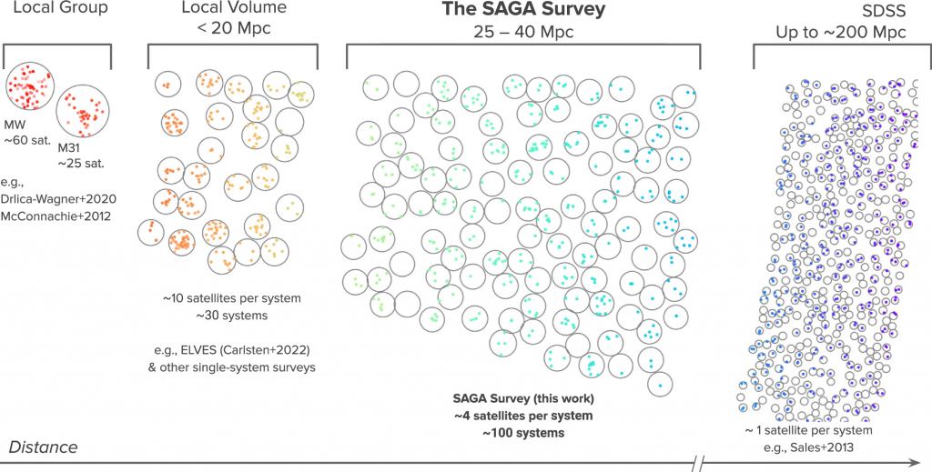 SAGA is aimed at understanding how dark matter haloes work. It examines low-mass satellite galaxies around galaxies similar in mass to the Milky Way. These satellites can be captured and drawn into the dark matter haloes of larger galaxies. SAGA has found several hundred of these satellite galaxies orbiting 101 Milky Way-mass galaxies.