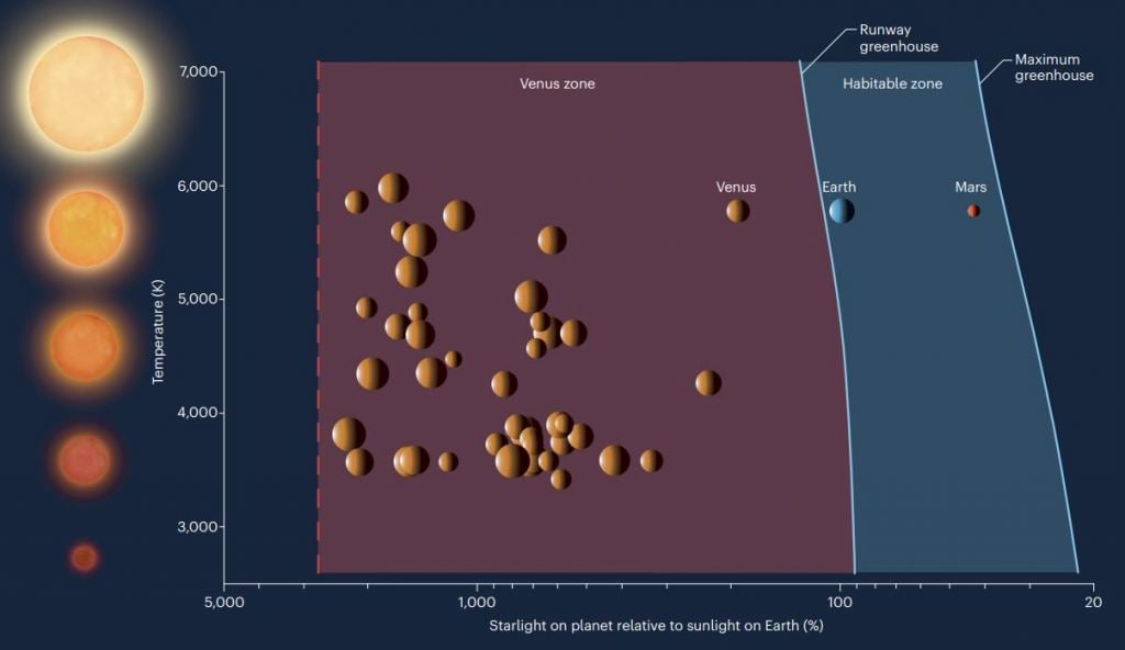 This figure from the research represents the Venus zone and the habitable zone as a function of stellar effective temperature and insolation flux received by the planet. The Venus zone is shaded in red, and the habitable zone is in blue. The images on the left show main sequence stars of various effective temperatures. The images of Venus indicate the location of Kepler candidates that lie within the Venus zone, scaled by the size of the planet. The Solar System planets of Venus, Earth and Mars are also shown. Image Credit: Habitable Zone Gallery/Chester Harman; Planets: NASA/JPL. Kane and Byrne, 2024.