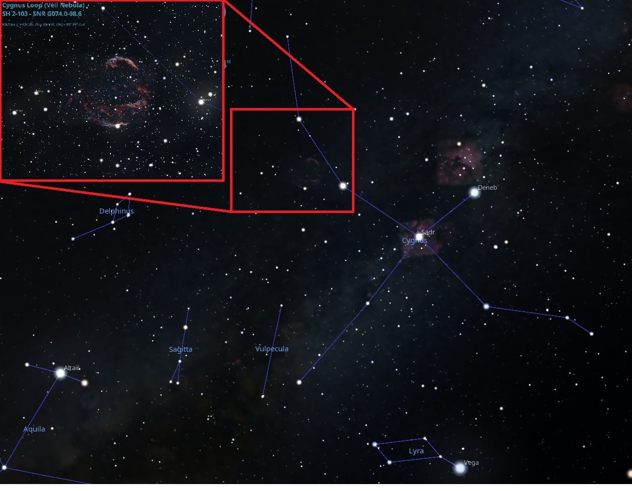 The location of the Cygnus Loop in the sky. Credit: Stellarium.