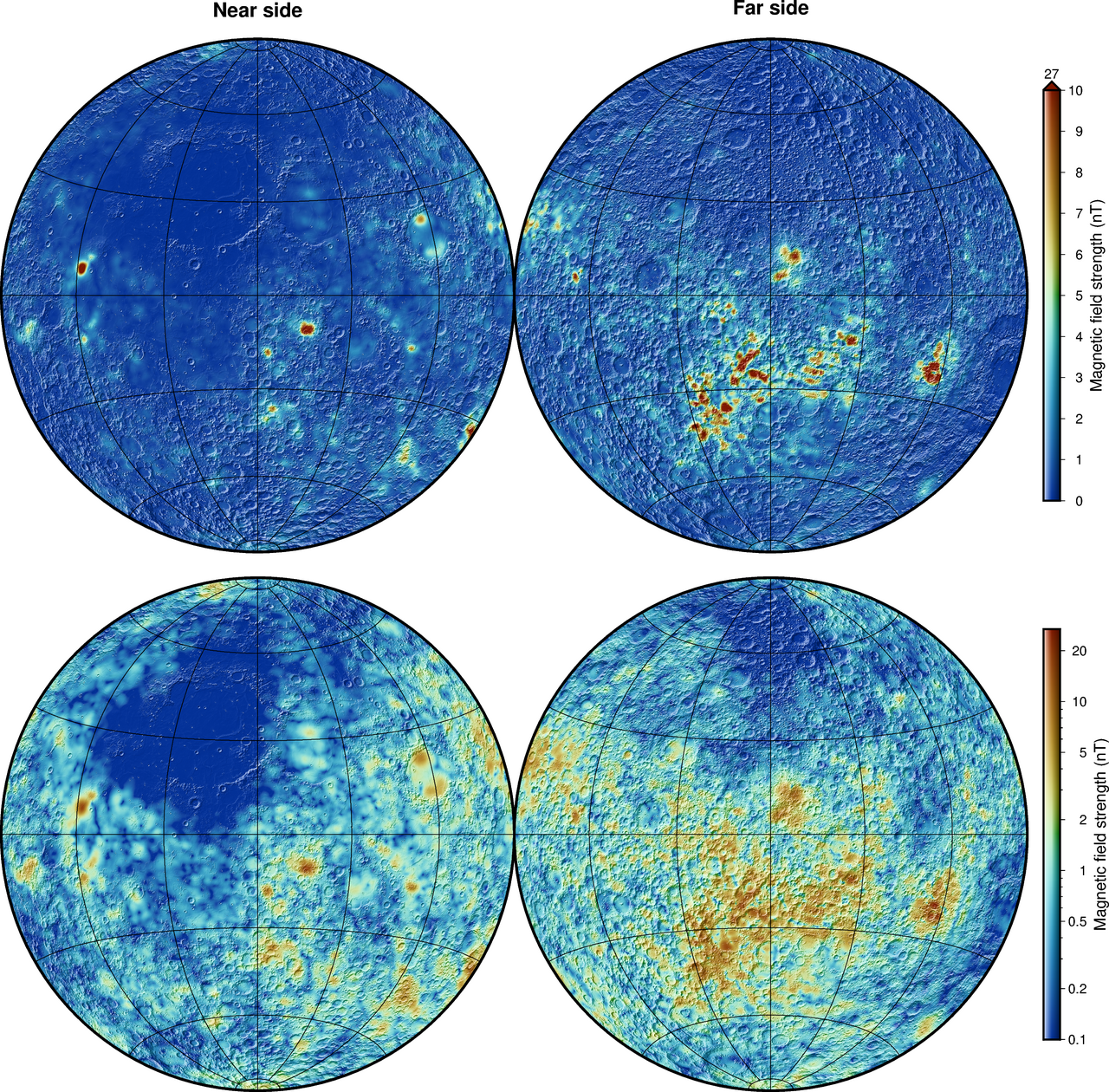 Total magnetic field strength 30 km above the surface of the Moon using a linear (upper) and logarithmic (lower) colour scale. The nearside and far-side hemispheres are on the left and right, and grid lines are plotted every 30 degrees of latitude and longitude (Credit : Mark A. Wieczorek)