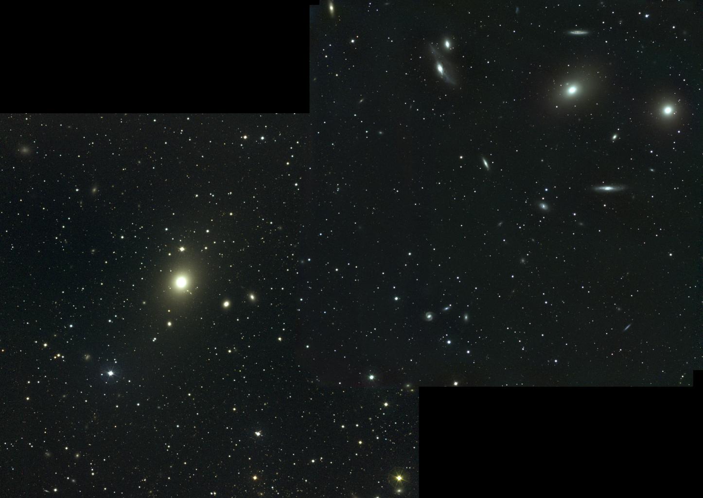 Good binoculars and small telescopes reveal this pair with ease as a matched set of ellipticals. Mid-sized telescopes will note the western member of the pair - M84 - is slightly brighter and visibly smaller. To the east and slightly north is larger M86 - whose nucleus is broader, and less intensely brilliant. In a larger scope, we see the galaxies literally leap out of the eyepiece at even the most modest magnifications. Strangely though, additional structure fails to be seen.