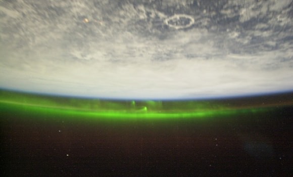 This is a picture of auroras over Earth, specifically Canada with the large Manicouagan impact crater in the foreground. Clouds and Earth's surface are illuminated by moonlight. The image was taken from the International Space Station by Mr. Wizard himself, astronaut Don Pettit. Read more about Pettit and his photography and wizardry at