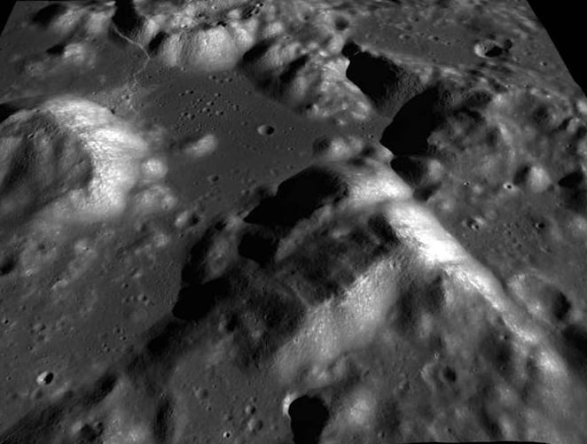 This is an image of Earth's Moon, taken by the Japanese Kaguya spacecraft, currently in orbit of the Moon. Interestingly, this image shows the Apollo 17 landing site at the Taurus-Littrow Valley, located on the southeastern rim of Mare Serenitatis. A flat valley is surrounded by mountains which were made of ejecta rocks from the when this "sea" was created by an asteroid impact. Since Kaguya is in a polar orbit of the moon, this image looks down from the south to the north. The spacecraft's Terrain Camera was used to create this 3-D-like image.