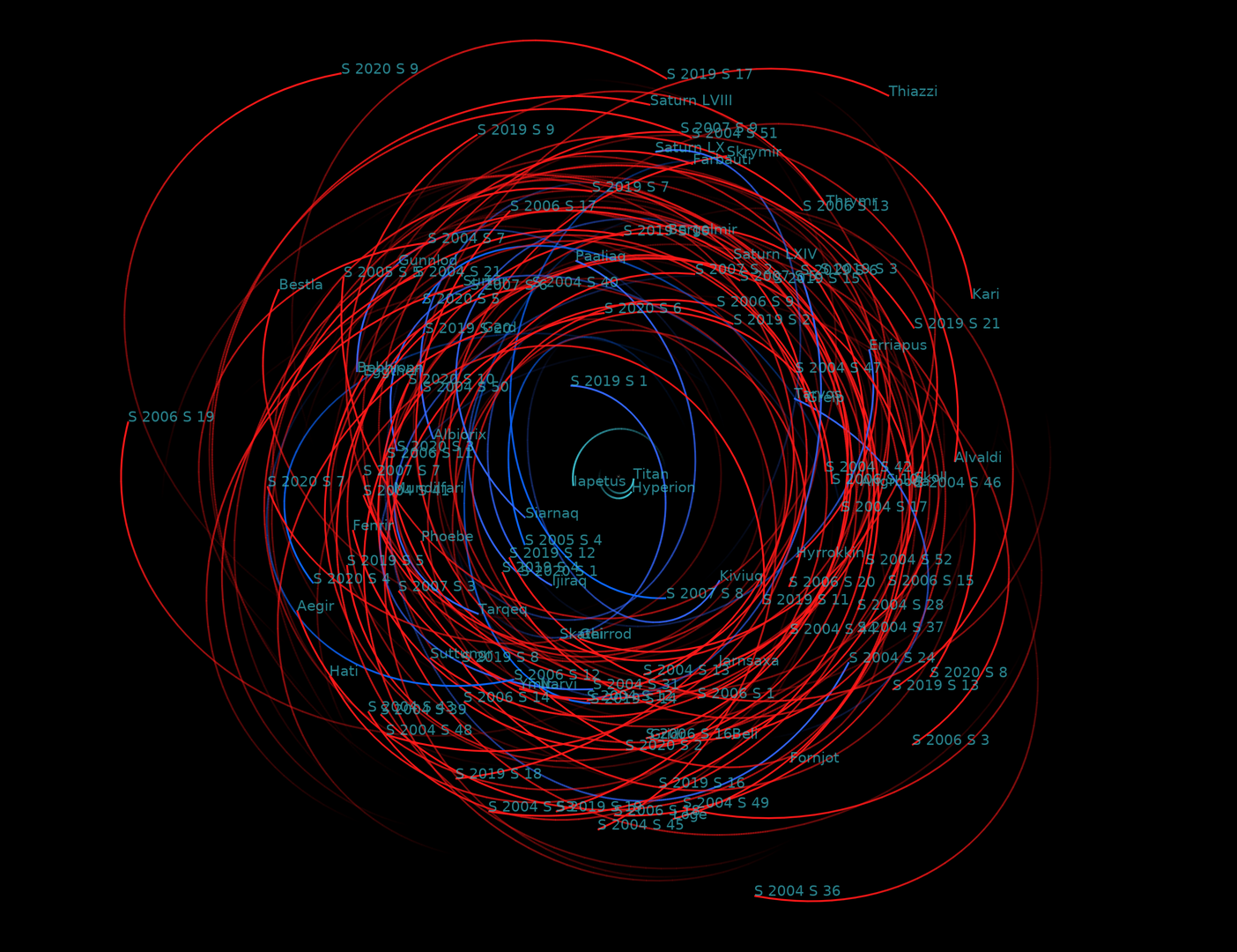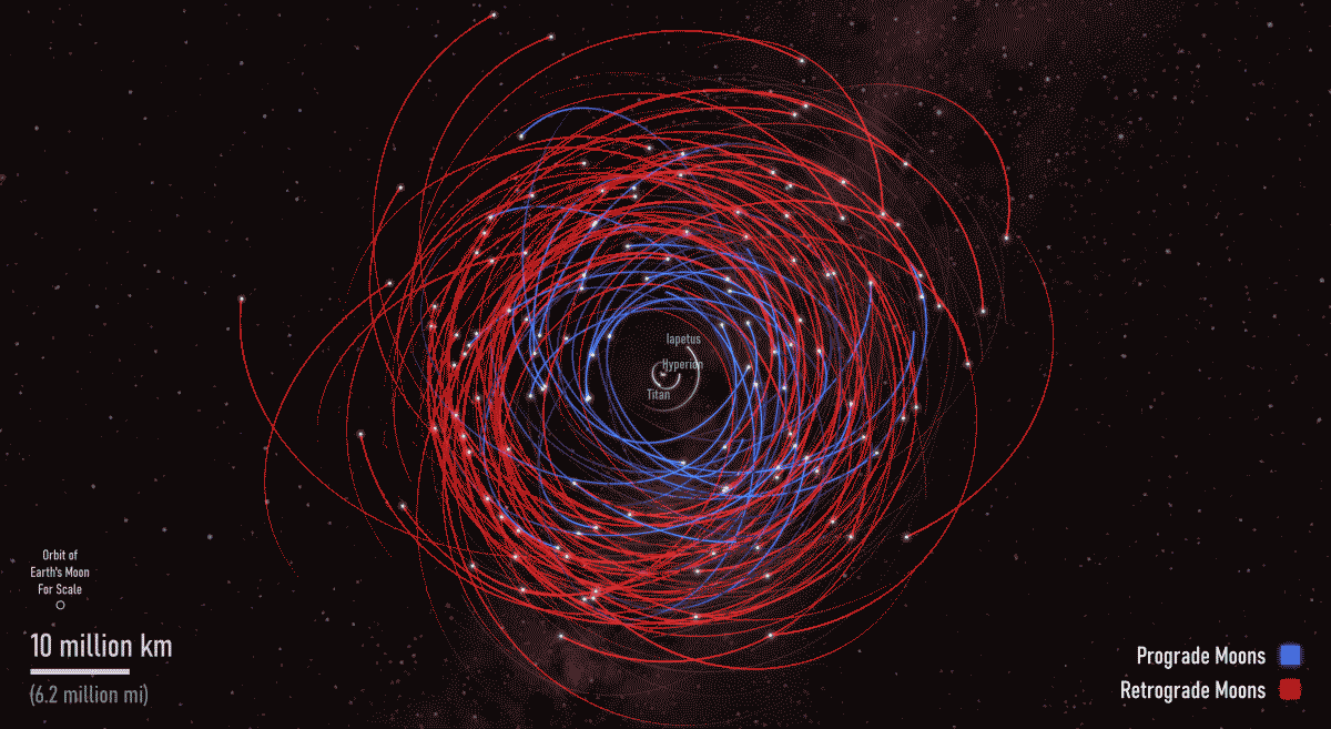 This image shows Saturn's 122 irregular moons, including Titan, Hyperion, and Iapetus, for comparison. This is from 2023 and doesn't include the new moons. Image Credit: By Nrco0e - Own work, CC BY-SA 4.0,https://commons.wikimedia.org/w/index.php?curid=132460053