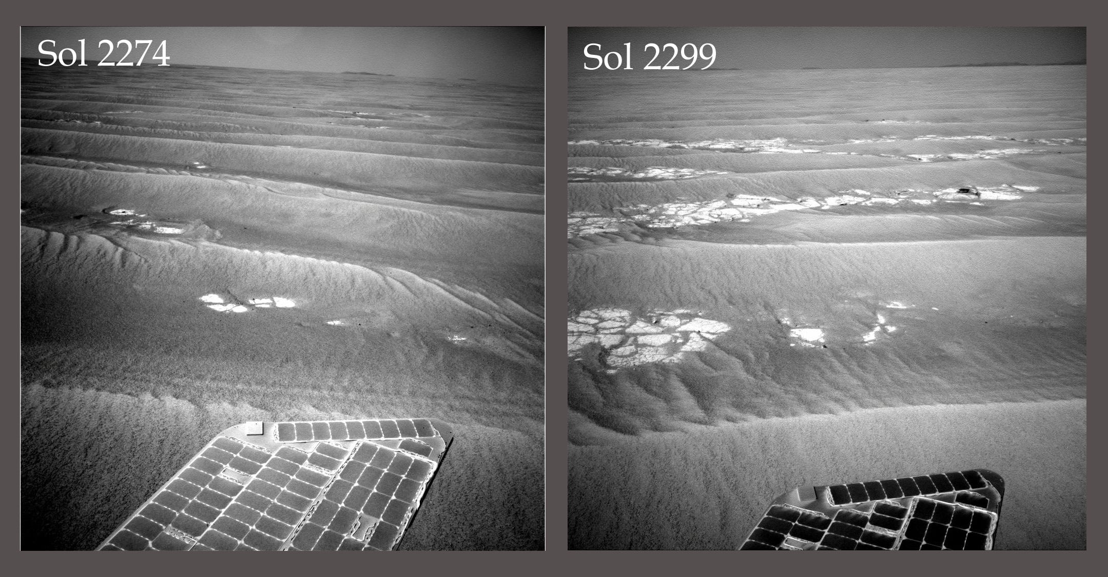 ), shows Oppy's solar panels on sol 2274 and 2299 (approximately June 18 and July 12 here on Earth) with a marked difference in the amount of dust on the panels. Yesterday, the Twitter account for the rovers,