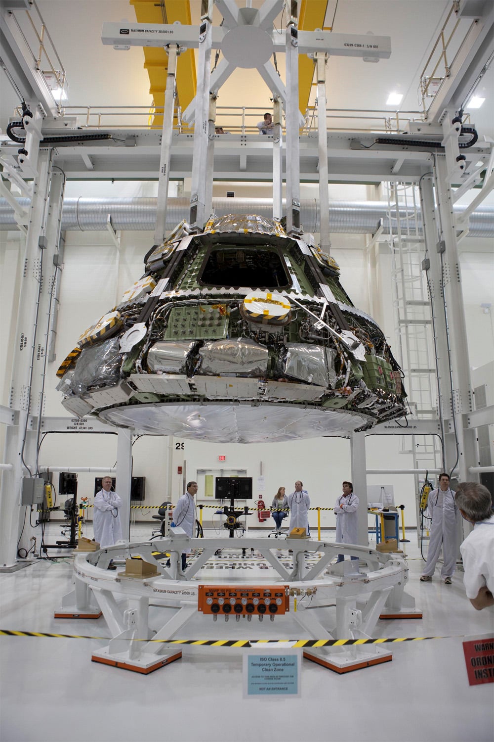 Lockheed Martin and NASA technicians mated the heat shield to the bottom of the capsule during assembly work inside the Operations and Checkout High Bay facility at KSC.