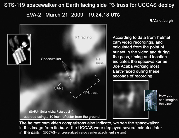Remember when it was a big deal when amateur astronomers starting imaging the International Space Station as seen from Earth, showing individual modules and other parts of the space station? One of the most proficient astrophotographers in that department has now just upped the game: Ralf Vandebergh has captured images of astronauts working outside the ISS during an EVA. Vandebergh, who lives in The Netherlands, used his 10-inch Newtonian backyard telescope to capture an image of STS-119 astronauts Joe Acaba and Steve Swanson working outside the ISS to install equipment on one of the trusses during the second EVA of the mission on March 21, 2009. Vandebergh told me he has been trying to image astronauts working outside the ISS since 2007, but hasn't been successful until now. "In all opportunities I had until now, the astronauts were not on a visible part of the station," he said "or they were in shadow or the pass or the seeing was simply not favourable."