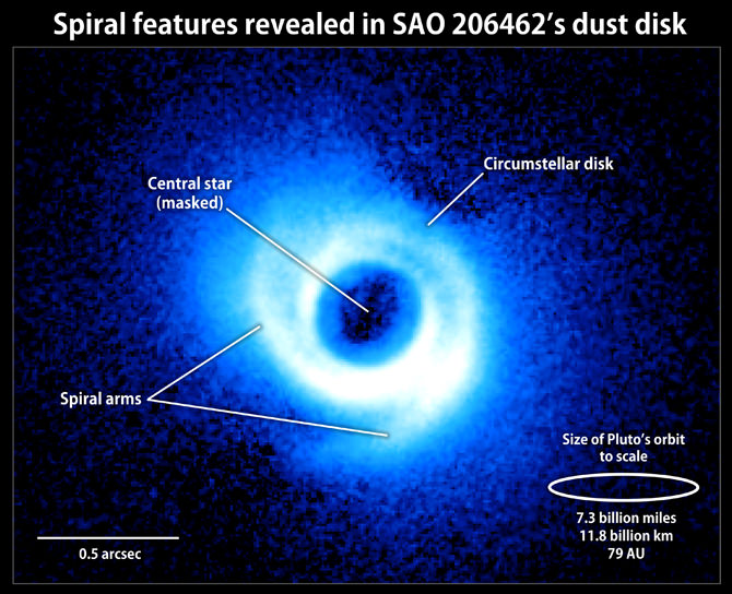 Astronomers have known for some time that a star named SAO 206462 has a disk surrounding it, and have studied it with all available techniques including with Hubble chronographic imagery. But new high contrast observations with the Subaru Telescope has shown a surprising double-spiral feature in the disk, which may point to planets in the act of forming. Spiral waves are propagating through the disk, which astronomers think come from objects creating perturbations. Carol Grady, an astronomer based at NASA's Goddard Space Flight Center said disks are the birthplace of planets, and astronomers know there should be a perturbation in the disk pointing to where a planet is located. "We thought we might find a wide gap, instead we were surprised to find a double spiral feature around the star in addition to the outer disk."