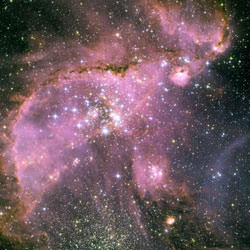 . This is a Hubble Space Telescope view of one of the most dynamic and intricately detailed star-forming regions in space, located 210,000 light-years away in the Small Magellanic Cloud (SMC), a satellite galaxy of our Milky Way. At the center of the region is a brilliant star cluster called NGC 346. A dramatic structure of arched, ragged filaments with a distinct ridge surrounds the cluster.